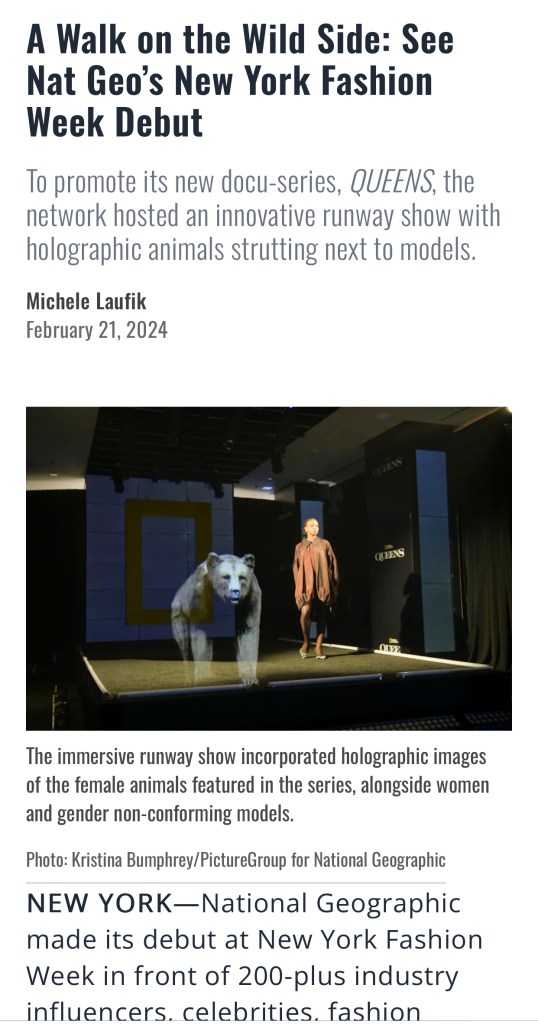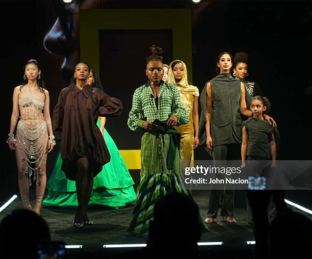 Models and dancers walked with holograms. The Fashion show was promoting the new series Queens, with narration by Angela Basset. Choreography was by Raymond Pinto.